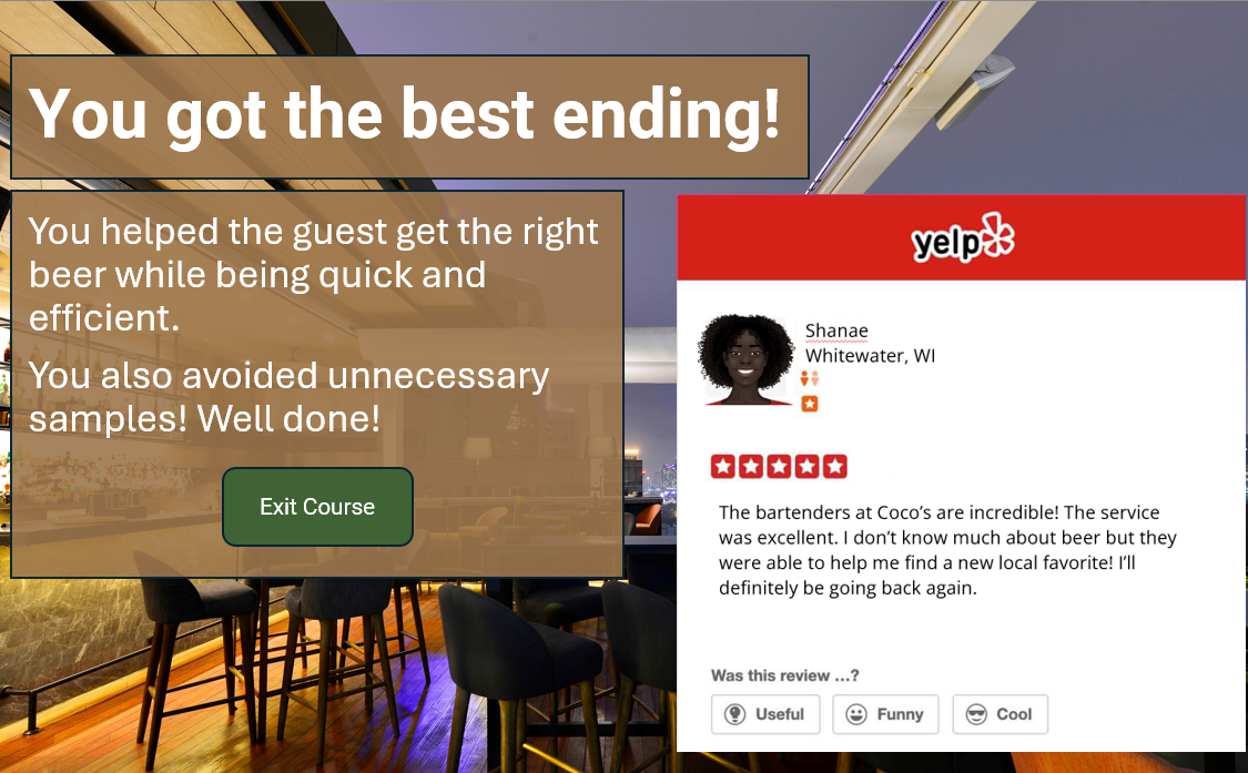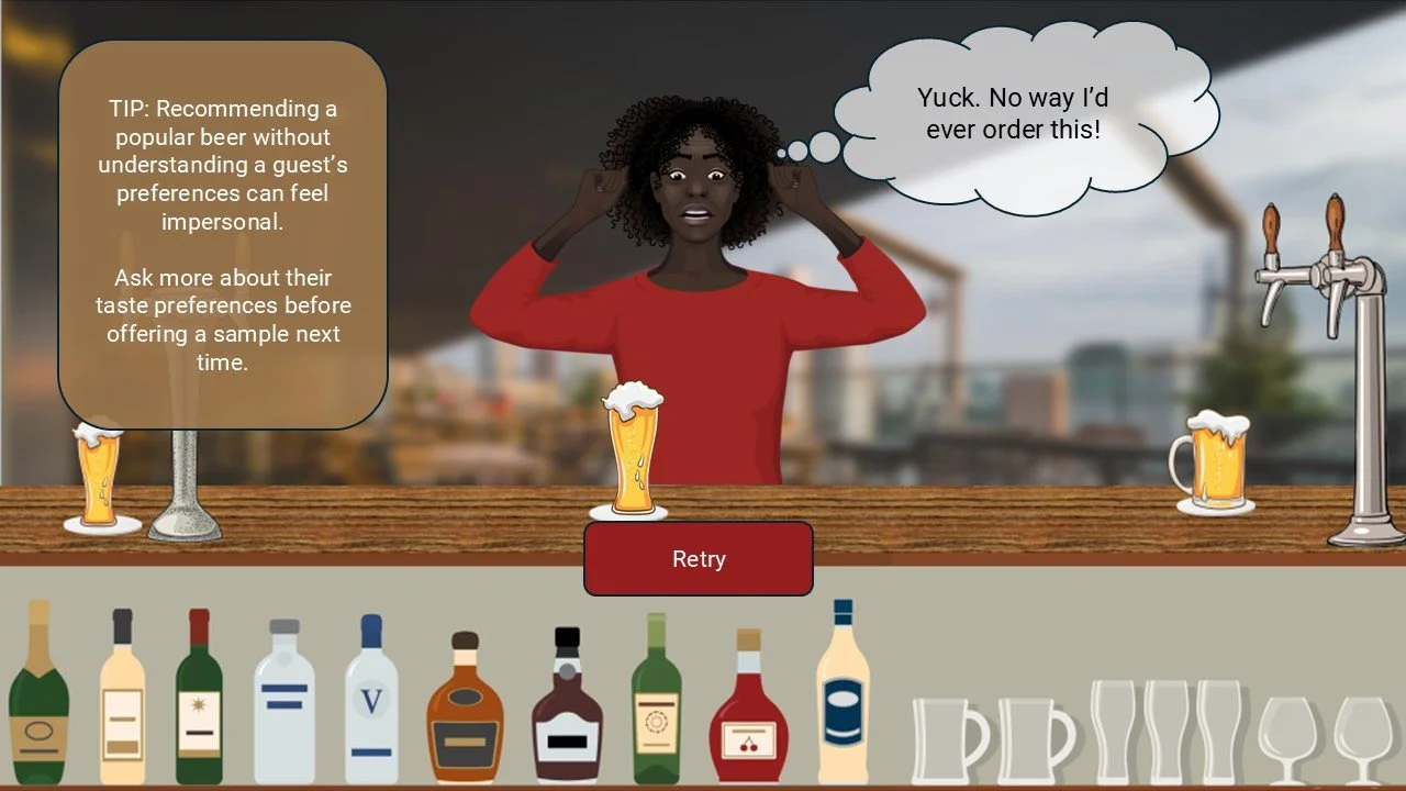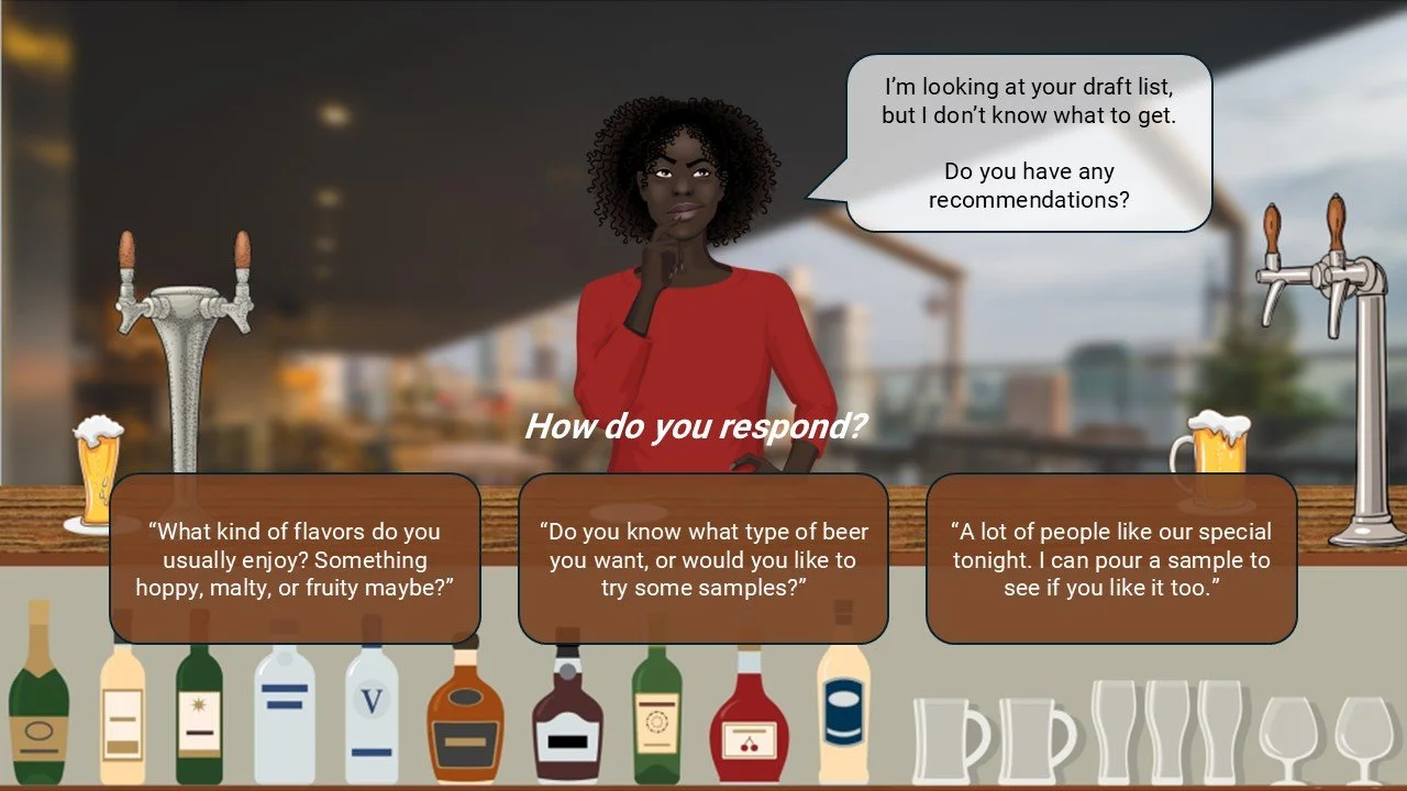 The design team identified several performance issues including wait time and “adequate” service. We plotted out a branching scenario to educate bartenders on how to speed up service, give a quality experience, and make informed recommendations on beer selection.
