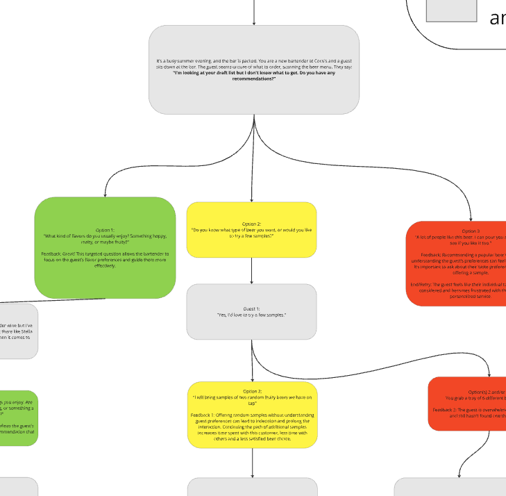 Our team used Miro to visually plot out all the branching paths of the bartender training. We highlighted the different options as meeting, partially meeting, and not meeting goals.